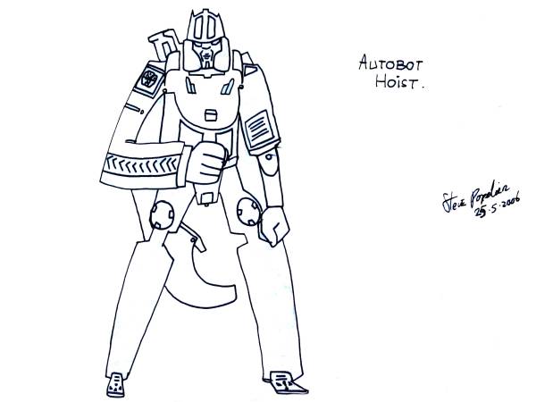 Dit is een eigen versie van de bestaande transformer Hoist. Op zijn rug hangt de schep van een graafmachine, terwijl het origineel de arm als schep heeft.